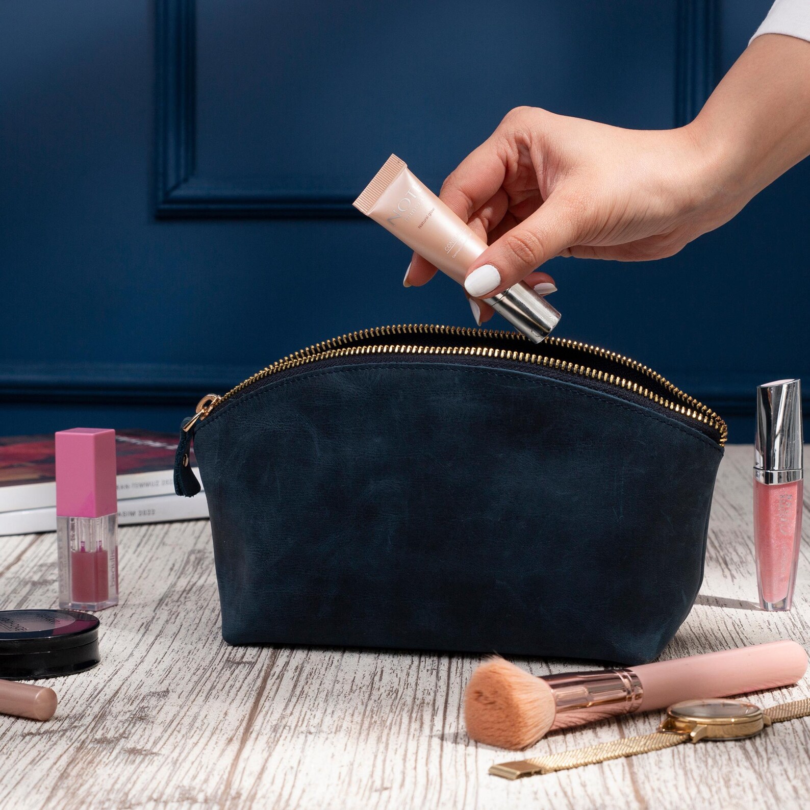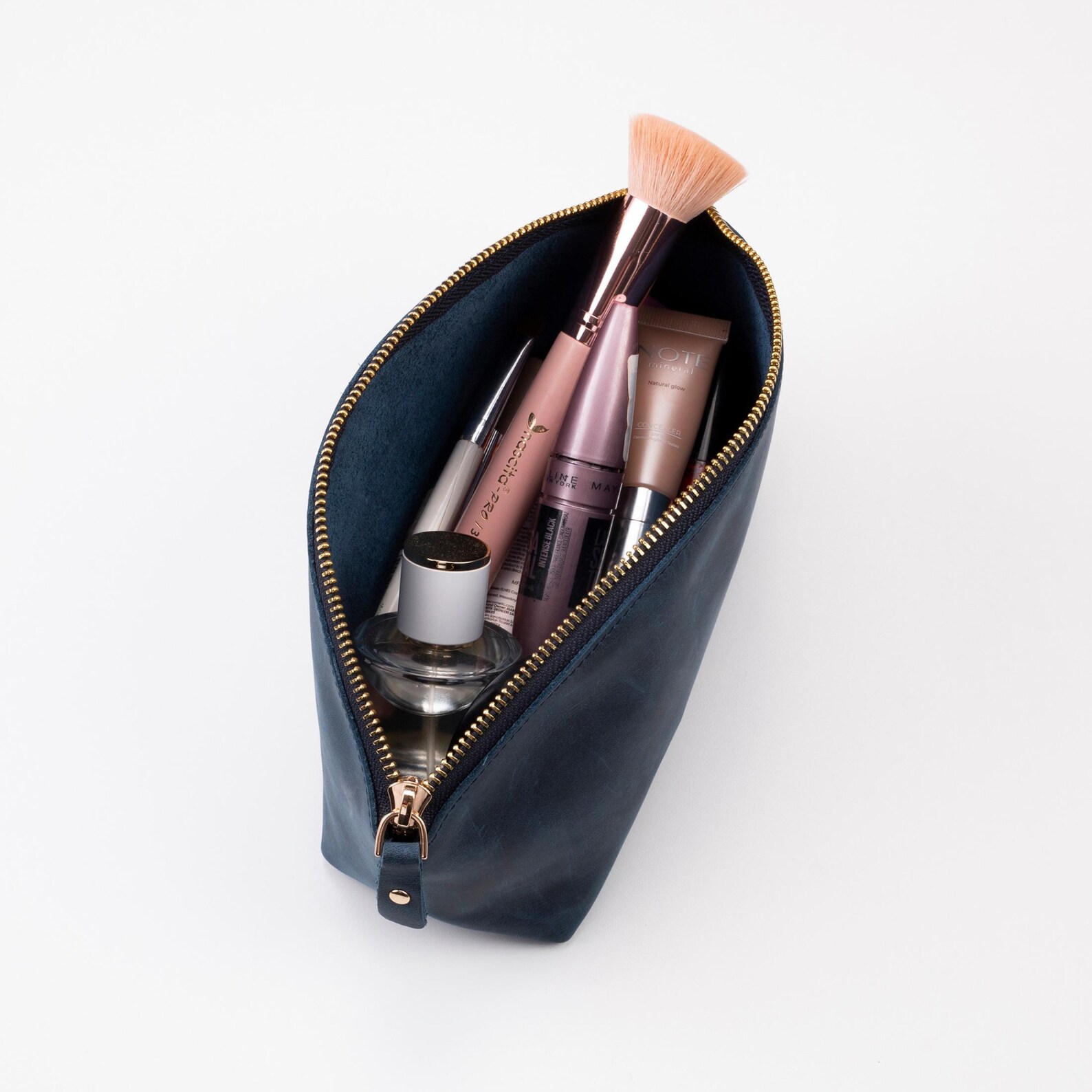 Personalized Leather Nice Best Travel Makeup Bag for Her, Small Cosmetic Bag Leather Makeup Pouch for Birtday Gift, Lay Flat Makeup Bag